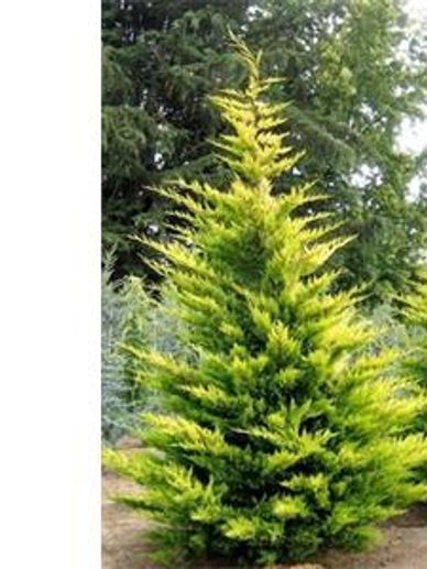 An attractive conifer (large tree) of a narrowly conical habit, Bright yellow foliage and holding its colour well. Full sun to part shade. Well drained soil. Matures to approximately 30’ tall and 10’ wide.