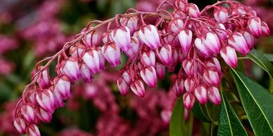 ”Forest Flame”: Delicate showy chains of white flowers, new leaves mature to pink , cream and then green. Grows 6-8 feet tall and wide, need afternoon shade or filtered sun. Deer resistant and loved by bees.