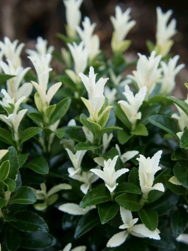 ”Aztec Pearl” : Award winning , grows 8 feet tall and wide, blooms late spring to early summer & again in fall. Fine, glossy, evergreen foliage. Fragrant flowers spring and summer, prefers sun to part shade.