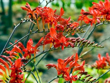 Bright, firery, red-orange flowers grow on compact plant. Grows approximately 6-8’ tall and wide. Flowers late spring to early fall.
