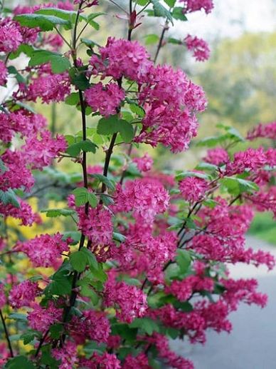 Flowering currant! Medium-sized bushy deciduous shrub noted for its abundant showy flowers and fall berries. Early to mid spring, drooping clusters of 10-30 small pink to deep red flower appear. They literally smother the shrub and create a brilliant flowers display. The blue-black berries are suitable for jam, jellies, pie, juice or syrup. Shades of yellow and red in fall! Grows to 10 feet tall and wide. Full sun to part shade. DROUGHT TOLERANT and DEER RESISTANT.