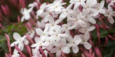 ”Polyanthum”: Prized for its spectacular floral display. An evergreen vine, budding pink, opening up to masses of intensely fragrant, long-tubed, white flowers, with rose-coloured outside. Grows 20 feet tall. Blooms in late winter and again in early spring. Sheltered location.