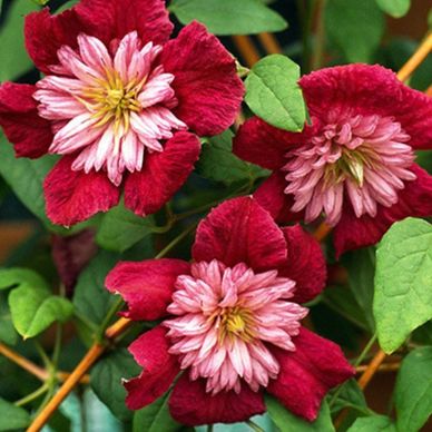 Never failing to impress! A profusion of large 4-6” glowing velvet in crimson flowers! Flowering early to mid summer to early fall, and is incredibly free-flowering. Compact, grows up to 6-12’ tall. Excellent choice for fences, trellises, arbours or through short shrubs.
