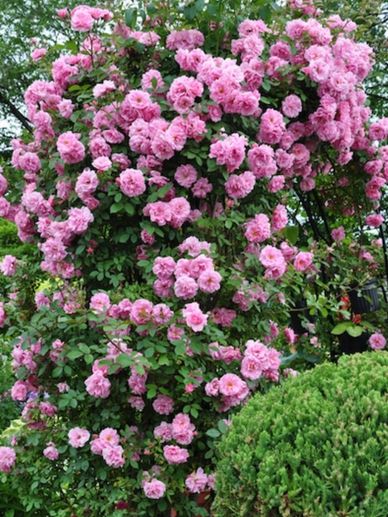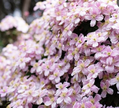 Masses of small, vanilla scented, pink flowers! Blooms in late spring, ideal for covering a fence or wall. No regular pruning required, only a cleanup after flowering. Deer resistant. Grows approximalty 20’ tall.